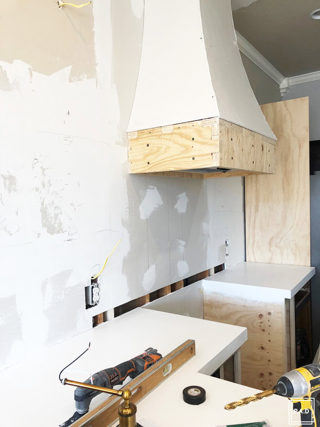 After installing our new DIY white concrete countertops we have kind of been in limbo but this week we finished out the drywall on the range hood then mapped out where the open shelving and sconce placement would be. (Please excuse the iPhone photography and the giant mess, renovations aren’t pretty and I have to snap photos in between so it’s just easiest to use my phone instead of getting all of the camera equipment out)