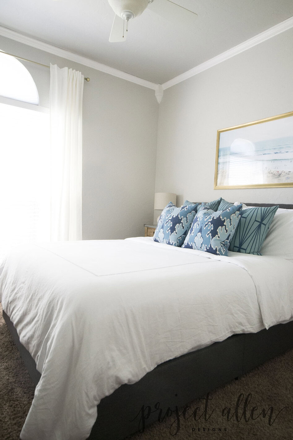 The nightstands were a bargain find at Homegoods and I love the way the metal top adds a dash of industrial flair while still blending well with the coastal theme. We went with white bed linens so we could easily throw them in the wash with a little bleach and have them come out good as new.